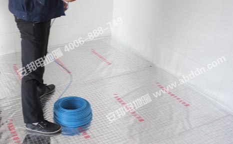施工材料:安邦雙導發熱電纜,型號ABV0013300 TXLP/2R/17;智能溫度控制器;地暖感溫探頭;地暖專用保溫板;地暖專用反射膜;鋼絲網、地暖專用鋁鉑膠帶、卡釘等。