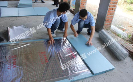施工材料:安邦單導發熱電纜,型號ABV01173100 TXLP/1/17;智能溫度控制器;地暖感溫探頭;地暖專用保溫板;地暖專用反射膜;鋼絲網等。