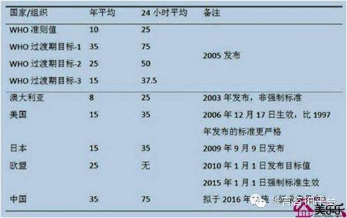 世衛組織為各國提出了非常嚴格的PM2.5標準,全球大部分城市都未能達到該標準。針對發展中國家,世衛組織也制訂了三個不同階段的準則值,其中第一階段為最寬的限值,新標準的PM2.5與該限值統一,而PM10此前的標準寬于第一階段目標值,新標準也將其提高,和世衛組織的第一階段限值一致。