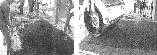 例如:鋪設了0.6m×4.0m的發熱電纜進行試驗。先在基層上鋪設2cm×2cm網格的鐵絲網,再在鐵絲網上綁扎發熱電纜,用扎絲固定但不要太緊,發熱電纜以S型方式布置,間距8cm。人工撒鋪瀝青混合料,厚度5cm,攤鋪均勻;用20t壓路機振動碾壓兩遍,再靜壓3遍。