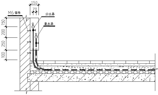 5.3.12 分水器、集水器在開始鋪設加熱管之前安裝的目的是保證柔性加熱管精確轉向和通入分水器、集水器內。分水器、集水器安裝示意圖如圖8所示。