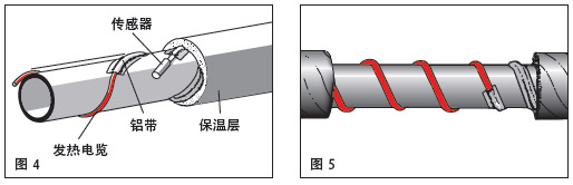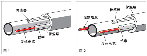塑料管道安裝發熱電纜前,要用鋁帶粘粘在管道上以便發熱電纜的固定,并可保證更好的熱分布。發熱電纜應附著在管道下方或對稱分布。傳感器的安裝與其他應用一樣,紅