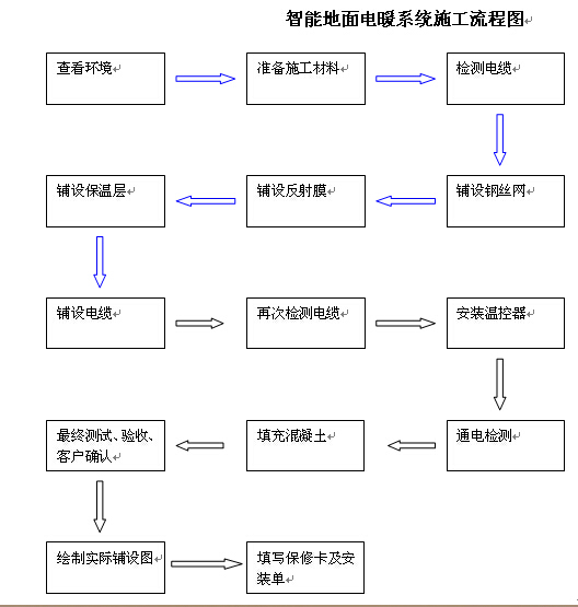 安裝的過程中需要鋪設電地暖保溫板、鋪設的時候,一定要保證地面平整和干凈,為下一道工序做好基礎。再鋪設電地暖反射膜,鋪設一定要平整,重疊處再用鋁箔膠密封,保證反射膜反熱效果。鋪設電地暖鋼絲網,每一個房間反射膜鋪好后,就開始鋪設鋼絲網,鋪好后用扎條固定牢固。然后進行發熱電纜的鋪設,鋪設前對發熱電纜進行檢測,記載檢測結果便于后續使用。鋪好發熱電纜后,再固定好地溫探頭,用歐姆搖表測量鋪好的電地暖電阻率。接下來就是混泥土的回填,最后安裝上溫控器。