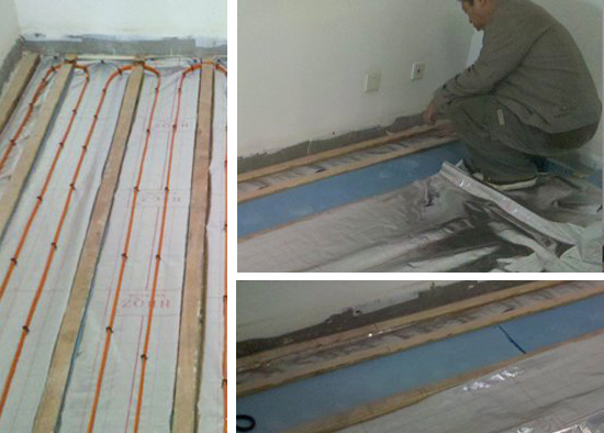 5、覆蓋水泥層,水泥層起到蓄熱的作用,不是越厚越好,厚度要適中,一般水泥層復雜2-3.5cm左右。鋪設時以平行的兩條木龍骨為高度參照,水泥厚度僅需與木龍骨齊平即可,這樣保障鋪設的高度不至于太高,與門高產生沖突。